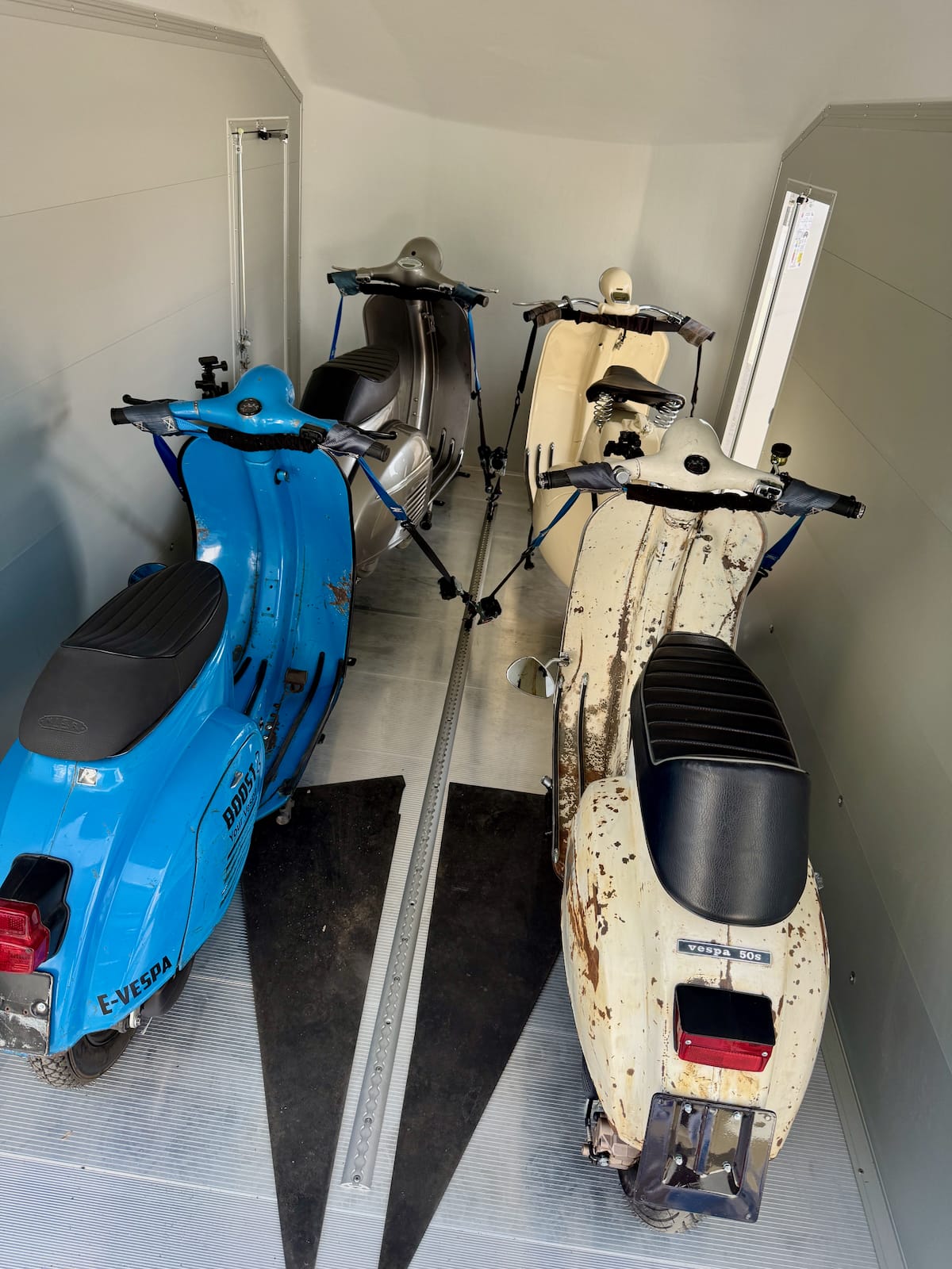 Wir waren mit unserem kompletten Line-up vor Ort: die 50er, die Sprint, die blaue V50R, die 50s mit HP Kit – und einem Projekt, das ehrlich gesagt auch uns jedes Mal kurz innehalten lässt. Dazu gab es Probefahrten, echte Aha-Momente und mindestens einen Gast, über den wir an anderer Stelle noch ausführlich berichten werden. Mehr dazu gleich.