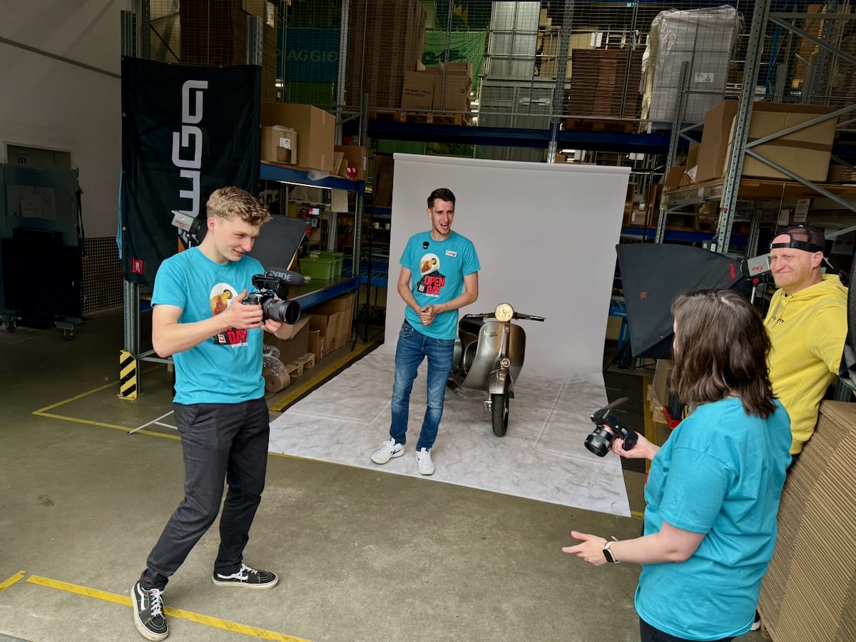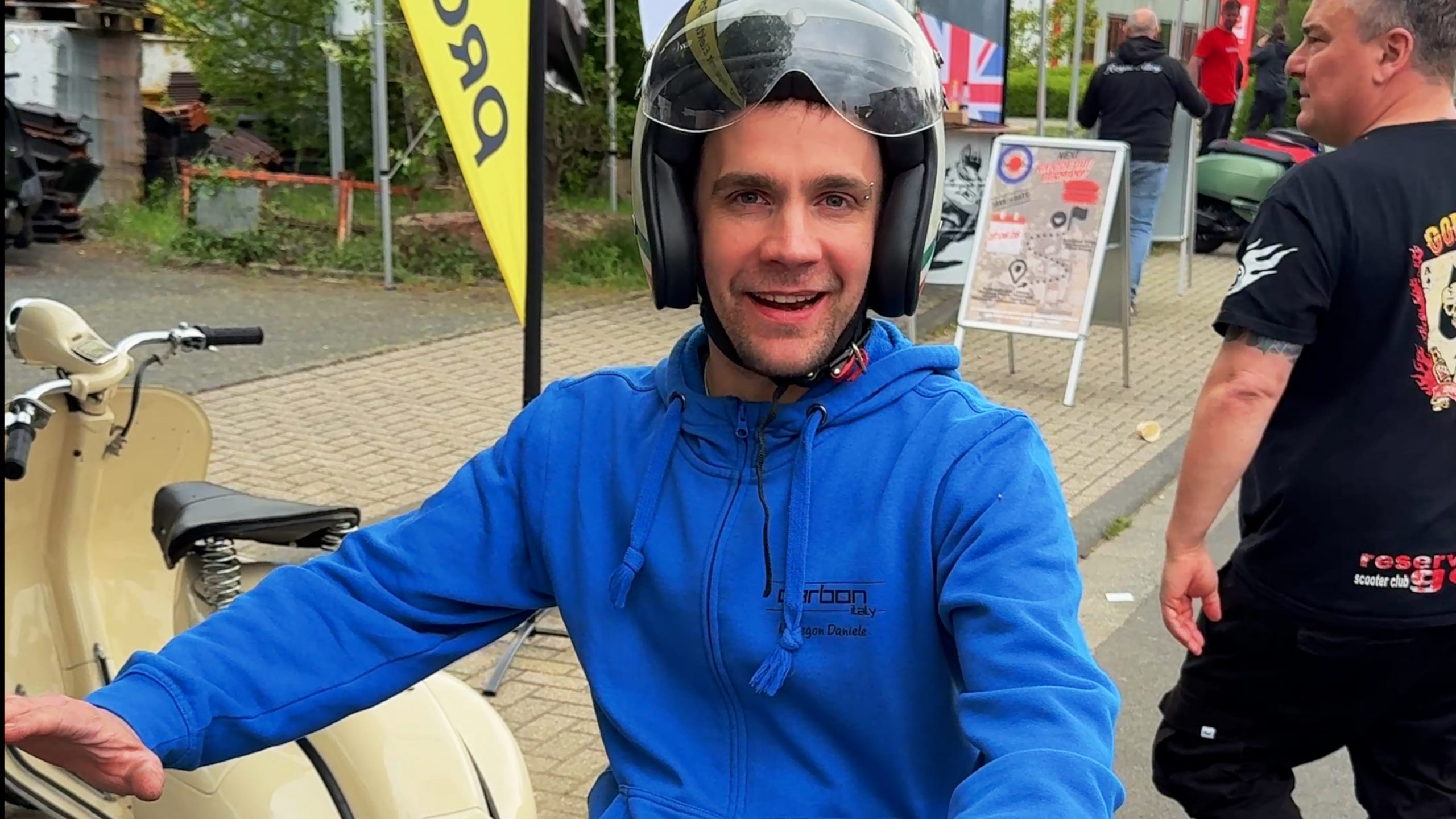 „Ich habe hier hinter mir an dem Roller den Simon von der Firma Prosimo und der hat mich verleitet, mehr oder weniger in Elektro noch mal zu fahren. Tatsächlich bin sowas noch nie gefahren. Ich mache jetzt mal eine kleine Probefahrt und mal schauen, was uns erwartet. Ich glaube, das ist jetzt so für mich das Highlight des Tages, um den Tag schön ausklingen zu lassen.“
